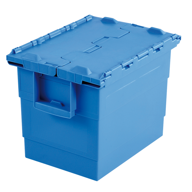 Bac de transport avec couvercle intégré de forme crocodile. Bac navette empilable idéal pour les livraisons.