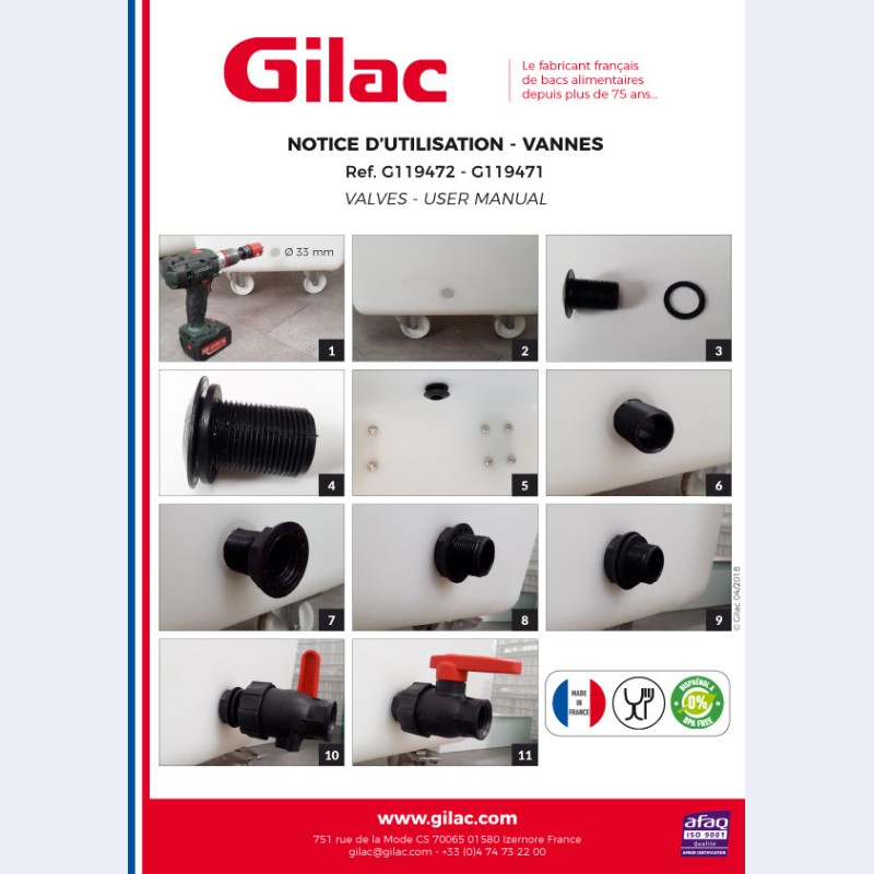 NB : vérifier la possibilité de rotation de la poignée de la vanne sans butter contre la cuve (sécurité = perçage suffisamment bas pour que cette poignée puisse passer sous la cuve)