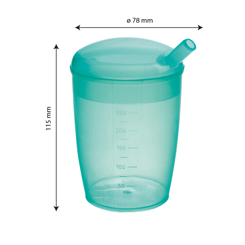 Verre avec couvercle et paille intégrée. Permet de boire sans renverser le contenu. Matériau translucide, niveau visible avec graduation.