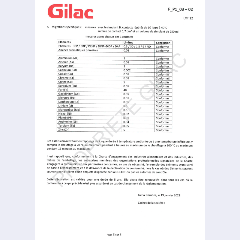 Chaque verre à malade GILAC est, si besoin, garanti apte au contact alimentaire, sans bisphenol A et est fourni avec un certificat d'alimentarité qui garantit le respect strict de l'ensemble des normes de sécurité alimentaire en vigueur en France et en Europe. Renseignez-vous auprès de notre service commercial.